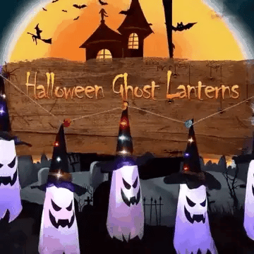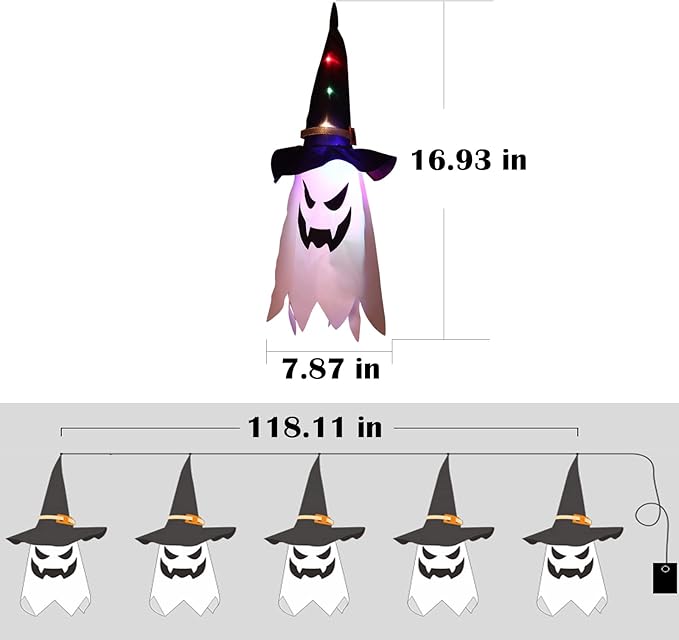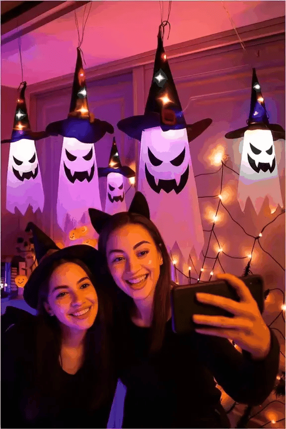 5 wizard-hat ghost-shaped LED lantern string lights with warm, flickering glow create a mysterious yet cozy Halloween atmosphere. Lightweight and easy to hang, perfect for indoors, porches, or gardens—effortlessly adding a magical-spooky touch to parties and holiday decor.