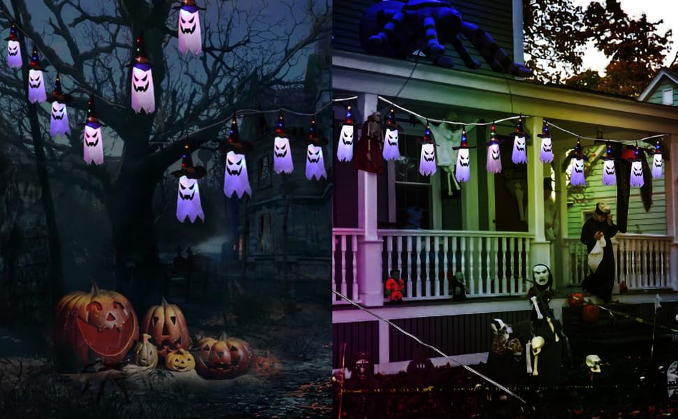 There are ghost faces are printed on both sides of this Halloween outdoor decoration, so you can stretch out the witch hat to make it become more three-dimensional. Then carefully pull the light string down a little, the ghost and the light will be perfectly combined. It will light you garden and attract your cute neighbors.