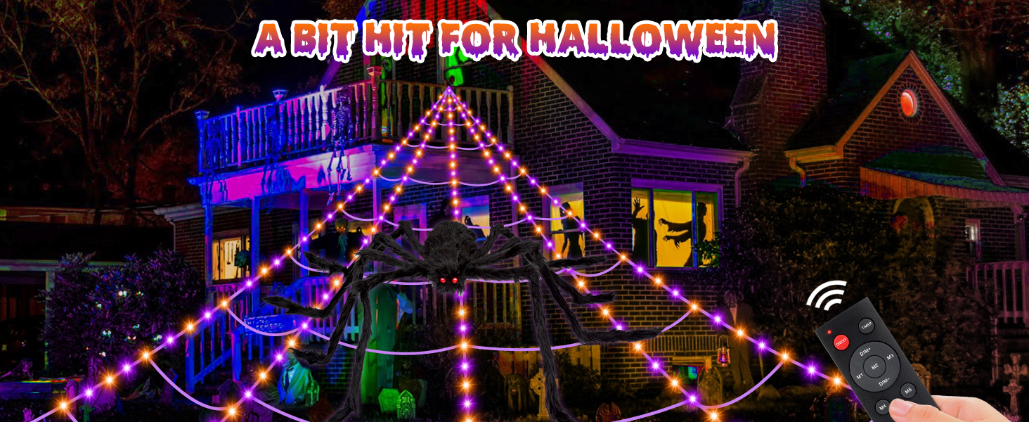includes a 200" giant spider webs Halloween decorations with 250 LED purple, orange lights, and 59" giant Halloween spider. Huge size enables greater coverage and make it looks real from far away. With more light beads, Halloween spider web lights expand the extent of brightness. Great addition for around the house. Placed it in outdoor yards & homes, give your neighbors and friends some surprises! So affordable pack to save time