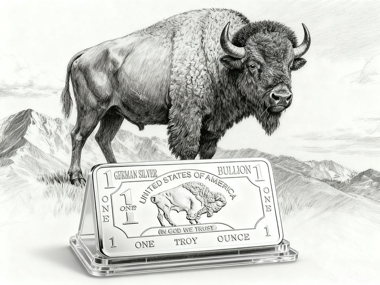 The back features a streamlined design: the bison, plus“Fine German Silver .999”and“One Troy Ounce”– emphasizing the alloy’s purity of craft (note: German silver’s “.999” refers to its alloy integrity, not fine silver content) and the bar’s weight.