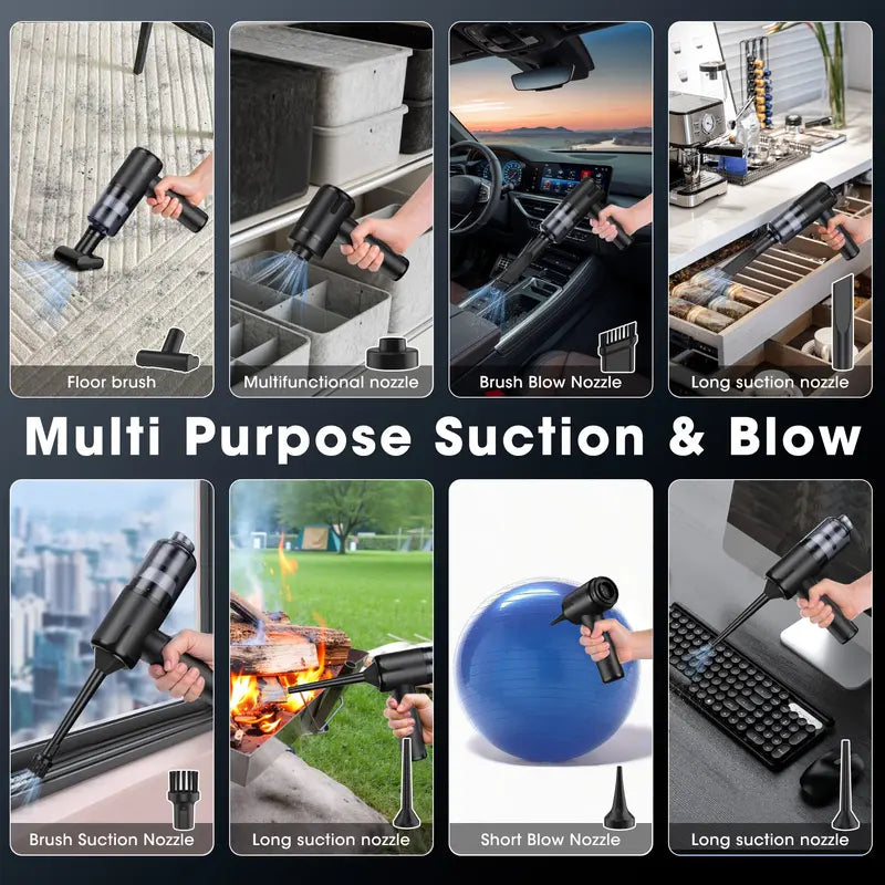 A: Its versatility comes from the 6 included accessories. It features a dual-function design: one end provides suction for cleaning, while the other end offers blowing and inflating capabilities, catering to various needs.
