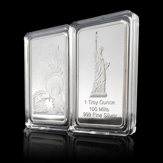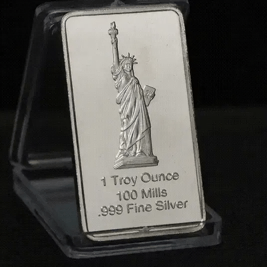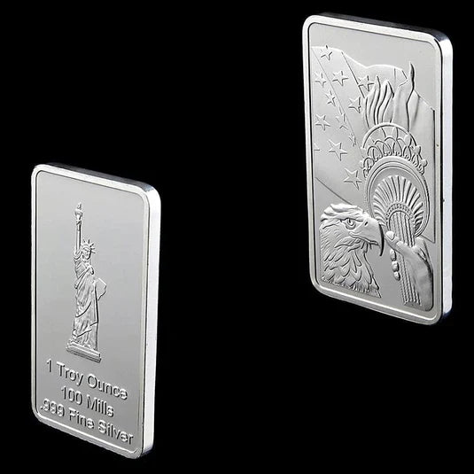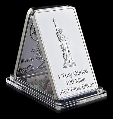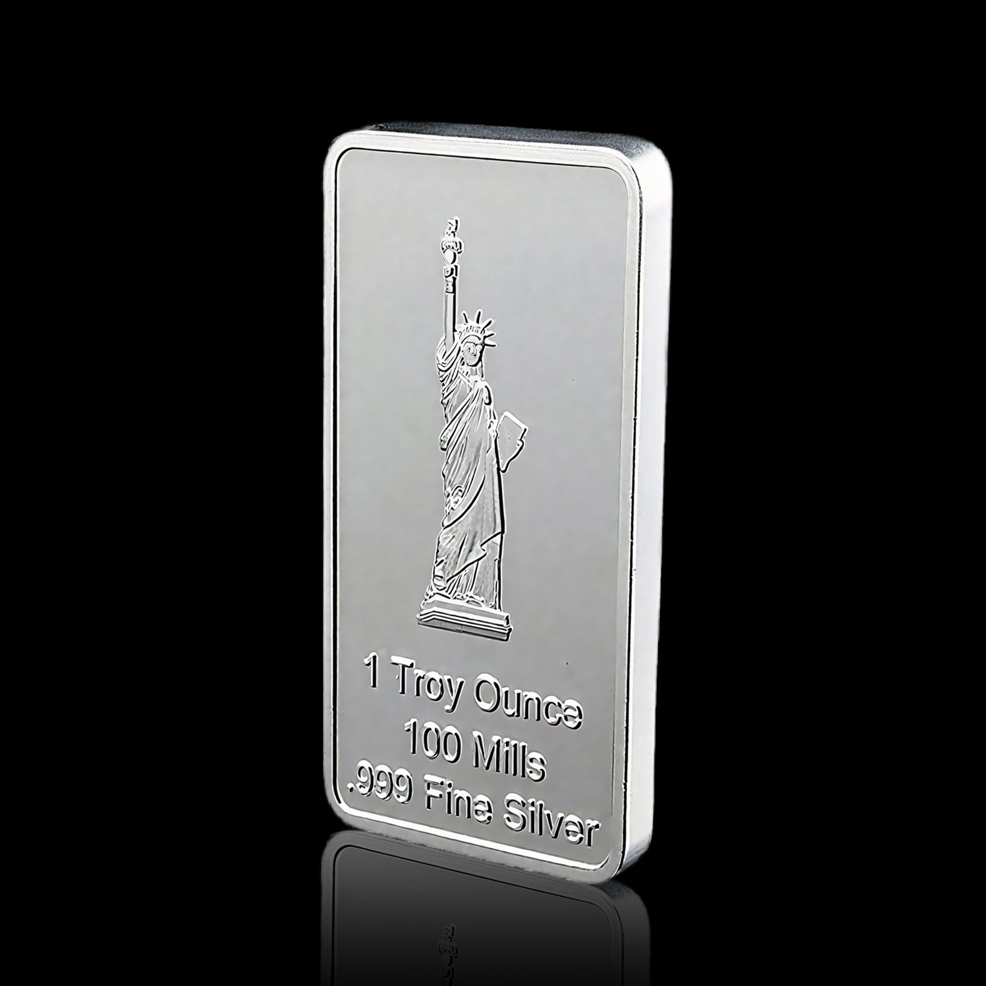 The front of the bar showcases a full-profile engraving of the Statue of Liberty—from her iconic crown with rays (symbolizing enlightenment and global freedom) to the torch she holds high (a beacon of hope). Below this powerful image, you’ll find the engravings:“1 Troy Ounce”,“100 Mills”, and“.999 Fine Silver”—clearly marking its weight and pure silver quality.