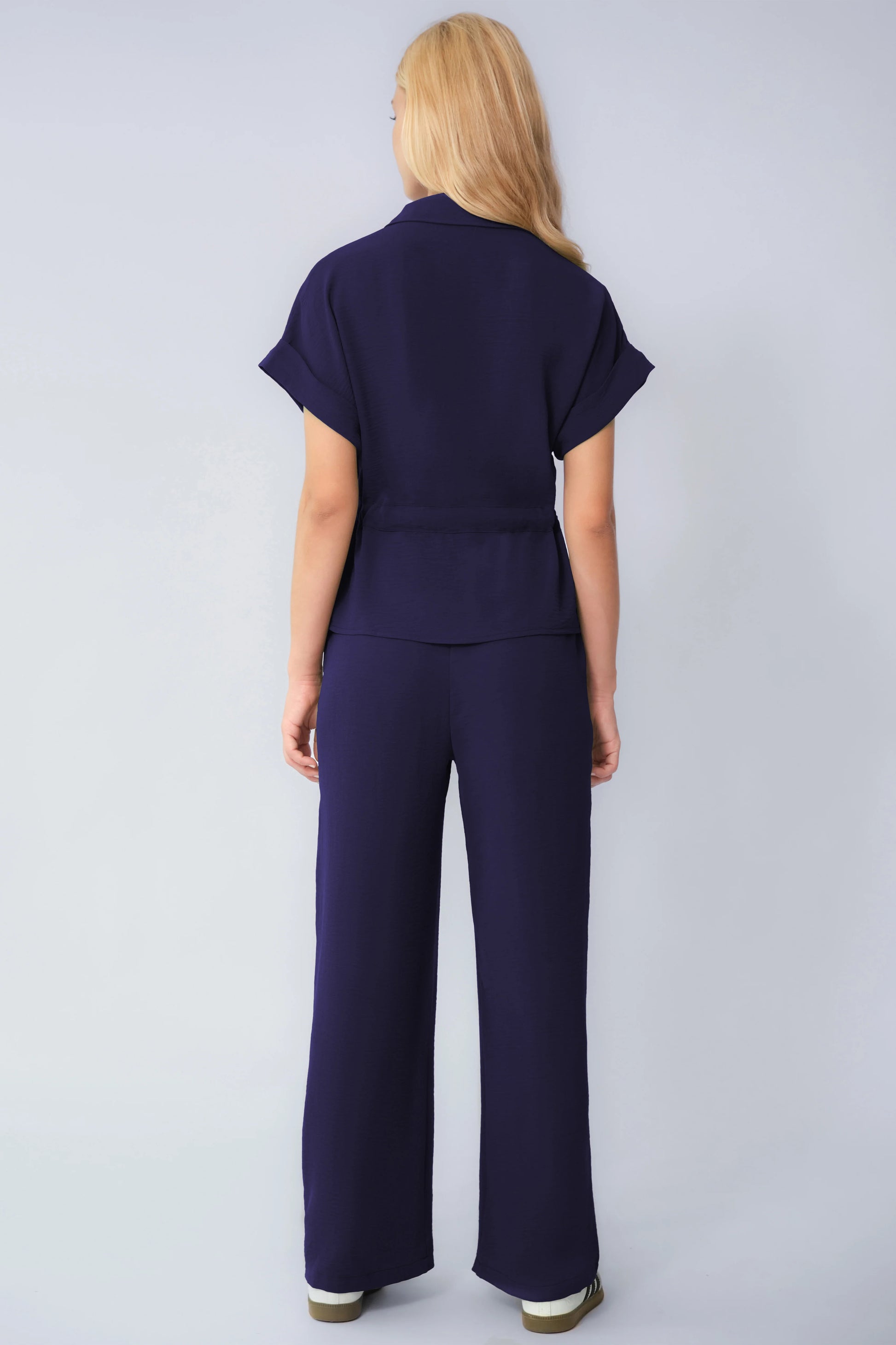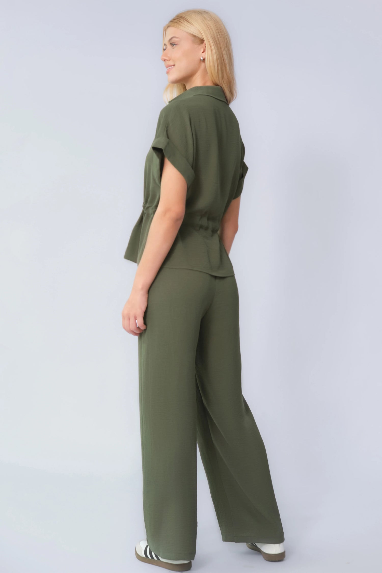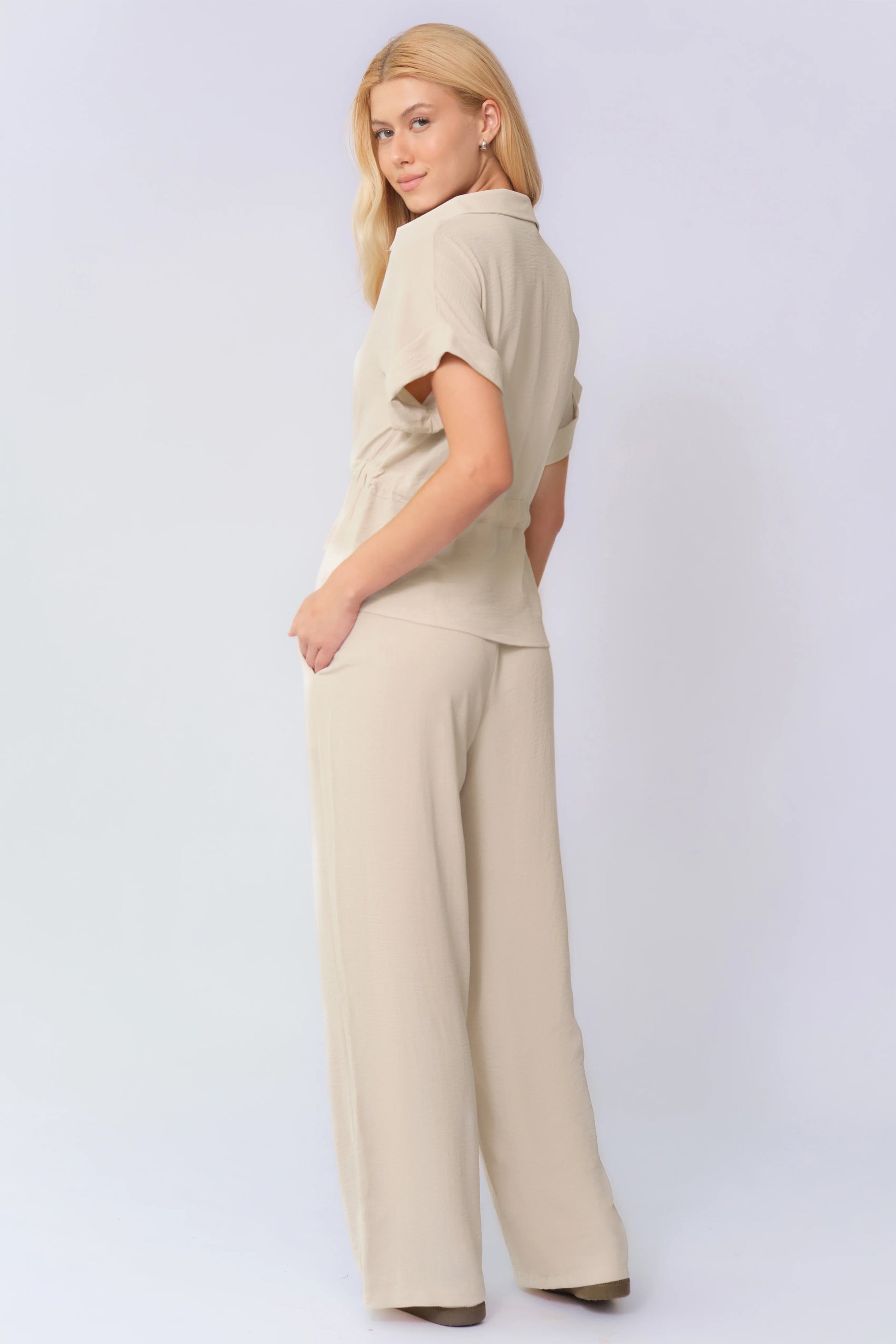 Elevate Your Everyday StyleThis coordinated set redefines casual sophistication with its timeless design and modern versatility. The collared rolled-up sleeve top offers a polished yet relaxed vibe, while the high-waisted wide-leg trousers create a sleek, elongated silhouette. Perfect for:• Office to After-Work – Pair with loafers for boardroom-ready power• Weekend Chic – Roll sleeves higher + sandals for brunch flair• Travel Essential – Wrinkle-resistant fabric stays fresh on the go ✈️