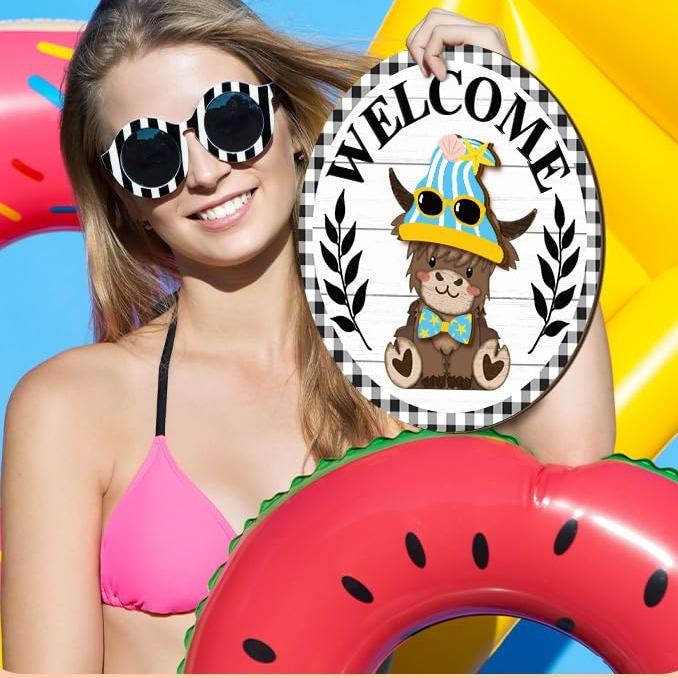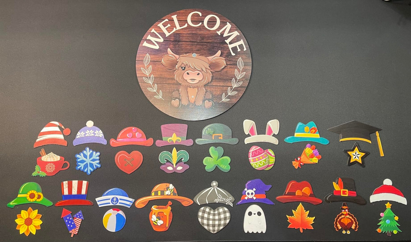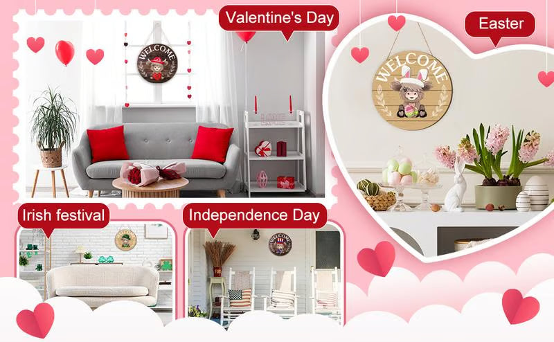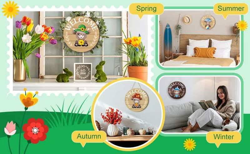 with its exquisite and attractive design, the Highlands cow welcome sign boasts versatility by catering to various holiday themes; Be it Christmas, Halloween, Easter, St. Paddy's Day, Spring, or Autumn, this welcome sign gratifies your festive decoration needs